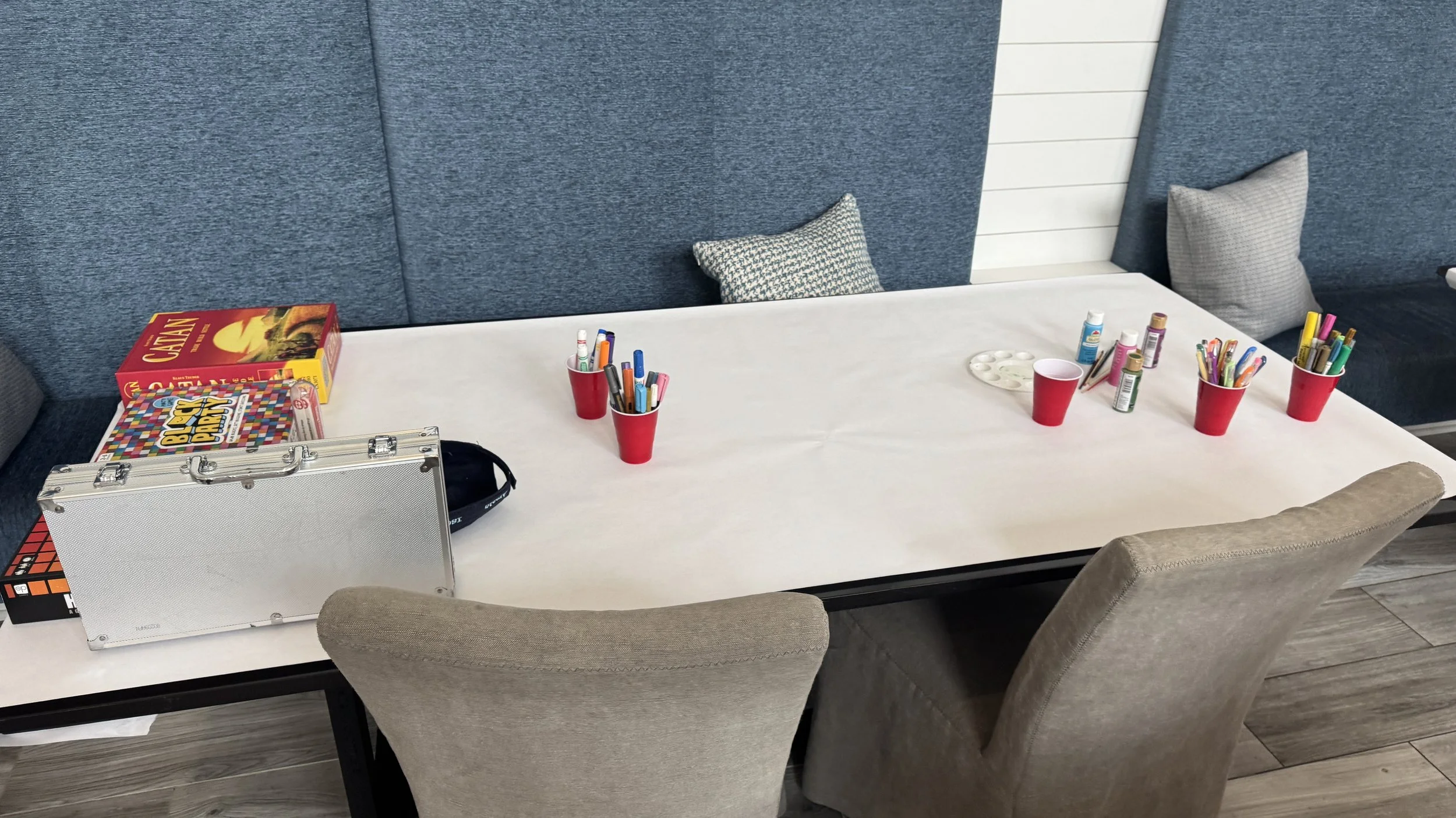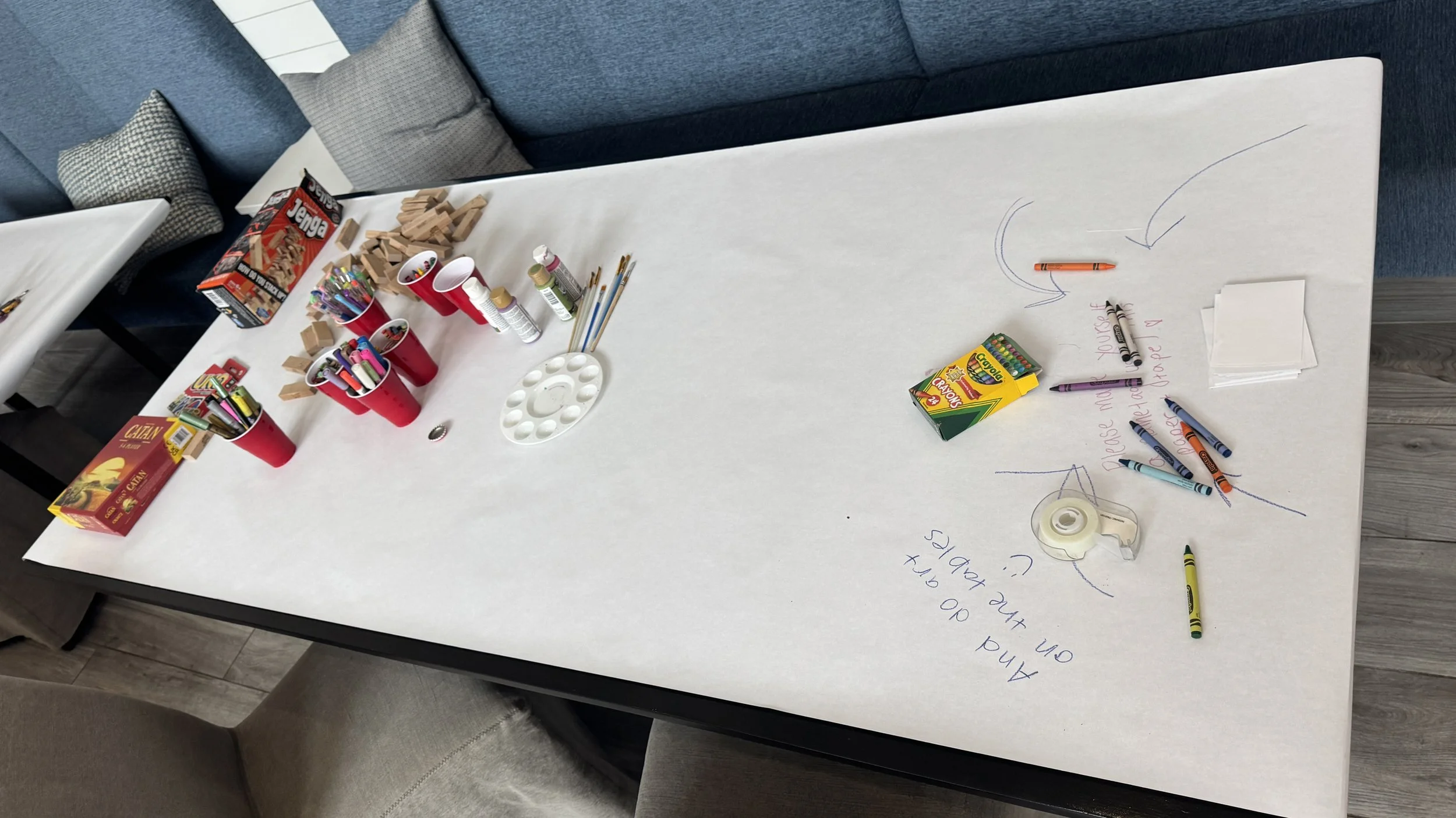 Speaking of paper… I covered all the tables in blank white paper from huge rolls we got. This was not only to keep things clean, but also for people to draw / write / doodle on! I loved how this turned out, I still have the messages and things people left! For art supplies, I brought over some of my gel pens, acrylic paints, paint brushes, paint pallets, crayons, paint pens, and regular markers. I also used extra little solo cups we had laying around for paint brush water.