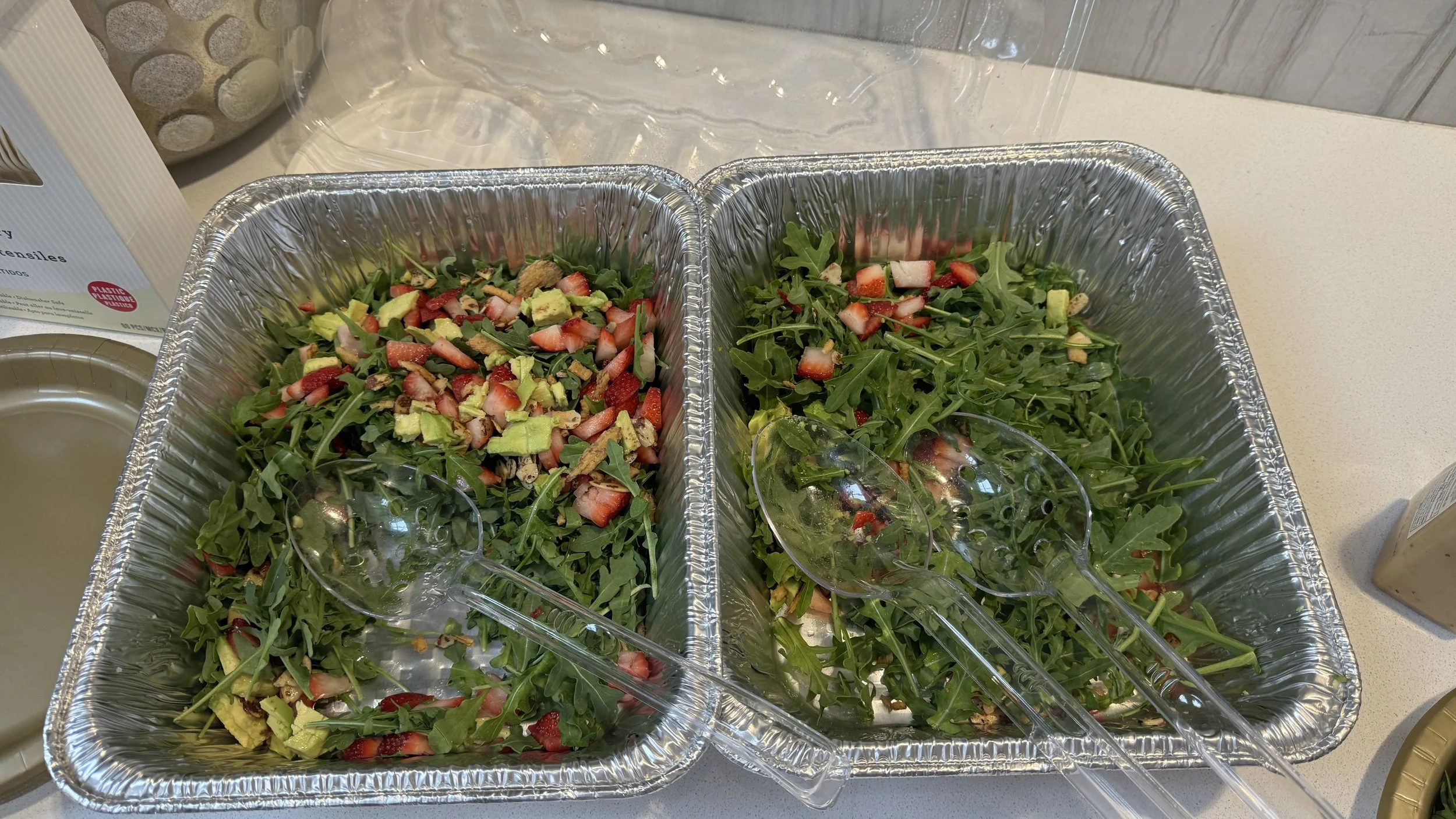 Thanks to my sister, the food was amazing. She made barbecue chicken skewers using a recipe I love and she also put together a gorgeous salad inspired by recipe pins I sent her. She made everything ahead of time and just heated up the skewers on the grill once it was time and she brought salad dressing for people to add as they wanted.