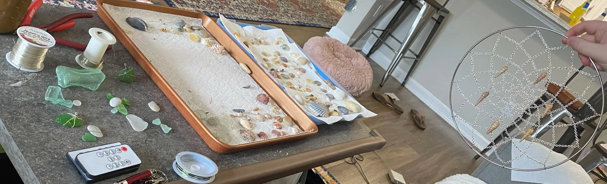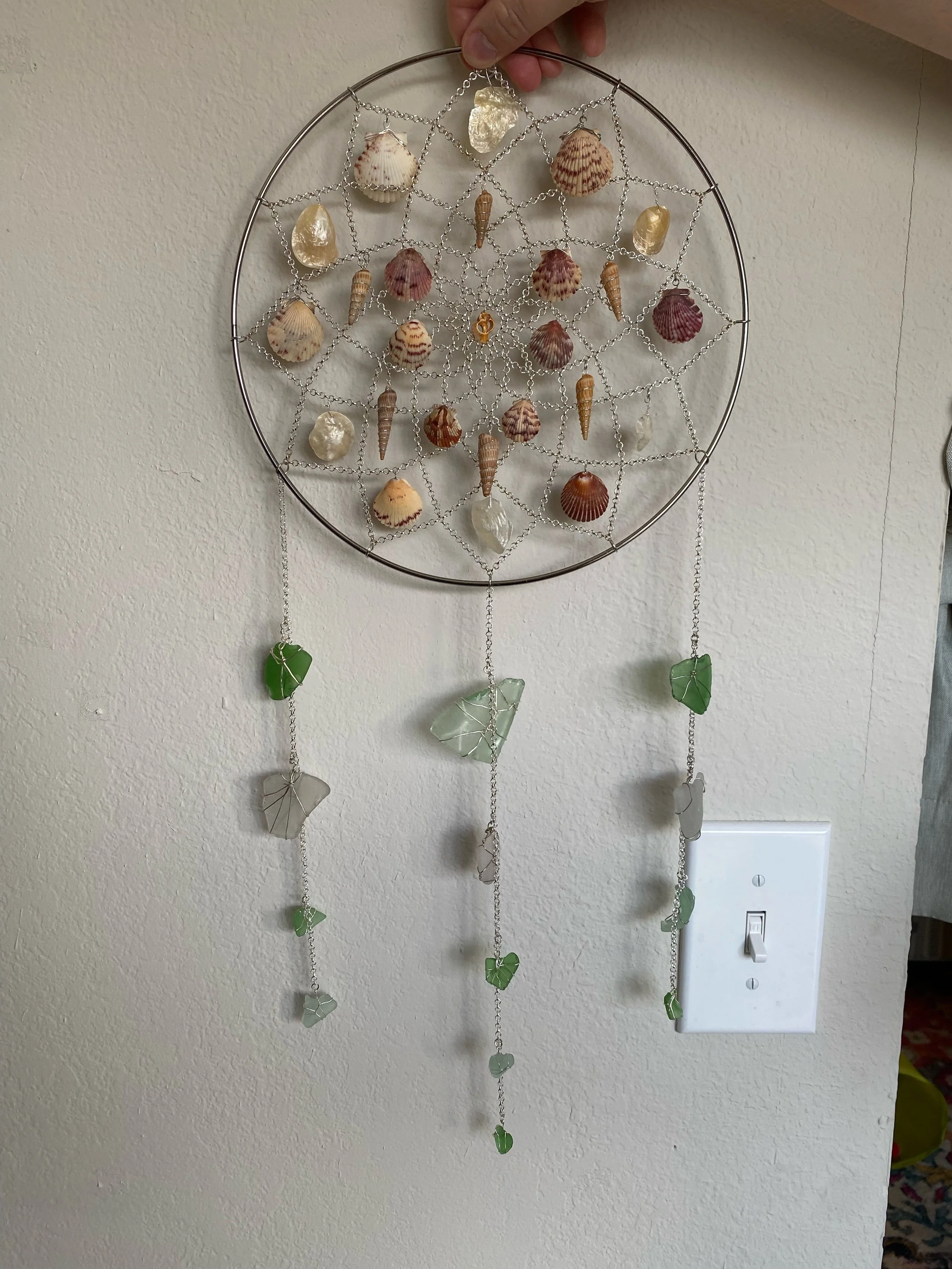 We filled it in with wire wrapped seashells I had collected and added strands of sea glass (also found on the beach by me) that hung from the bottom. Each piece was wrapped by hand and attached in little columns that caught the light. This was definitely tricky but really satisfying!! When it was finished, it looked like something you would see at a craft fair and we were so proud lol. And the best part is that it was one of a kind and made just for her.
